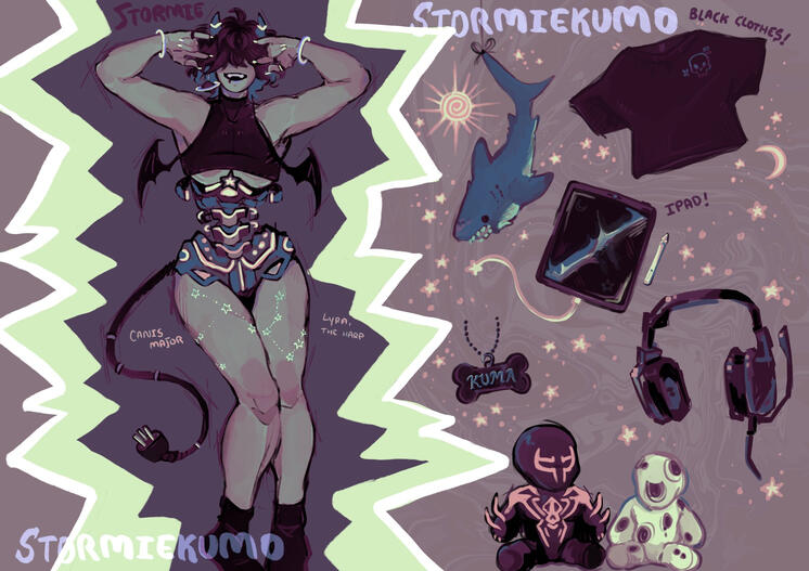 FNAF, Minecraft (MCD i miss you), Outlast, dead by daylight, Horzion (zero dawn & forbidden west), D&D, Baldur's Gate, Dungeon Meshi, MHA, JJK, WHA(witch hat atelier), CSM, Mob psycho, Death Note, Alien Stage, ATLA & Korra, Arcane, Pokemon (Zoroark, Dragonite, & Noivern), Hoyoverse games' characters (Tartaglia, Zhongli, Raiden, Itto, Albedo, Lumine, Tighnari, Cyno, Acheron, Blade, Kafka, Jing Yuan, Gallagher, Boothill, Robin, Sunday, Black Swan, Feixiao, Von Lycaon, Billy Kid, Nicole, Jane Doe), Wuthering Waves, Mystic messenger, Love and Deepspace, Cookie run kingdom, Sun Haven